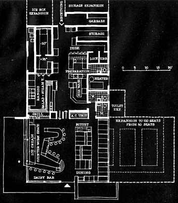 Ultimate Plan proposed by Nims combines all kitchen improvements he developed for various types of Howard Howard Johnson restaurants...Core of kitchen is straight traffic aisle, replacing zigzag isle in the original plan. Straight open core not only reduces steps but gives manager easier supervision of entire kitchen operation.